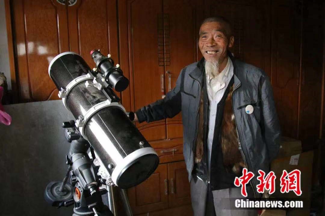Wu Shiying and his large astronomical telescope, which is now the most valuable thing in his house. (Photo/Cao Zhonghong)
