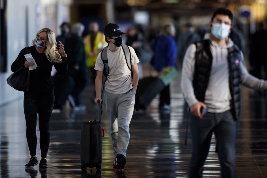 Travelers wearing face masks are seen at Reagan National Airport in Arlington, Virginia, the United States, Nov. 24, 2020. (Photo by Ting Shen/Xinhua)