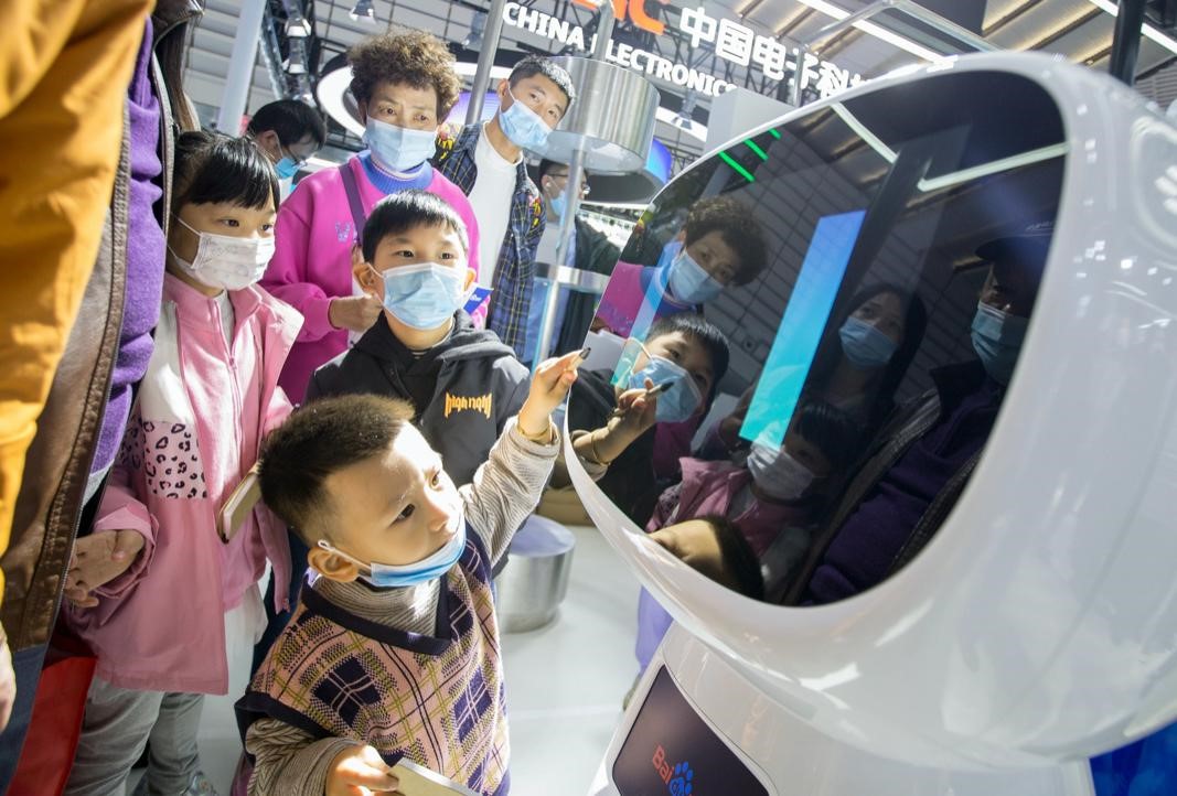 Children interact with Xiaodu, a smart robot rolled out by Chinese search engine giant Baidu, during the Light of Internet Expo of the 2020 WIC, Nov. 22. (Photo by Zhai Huiyong/People's Daily Online)