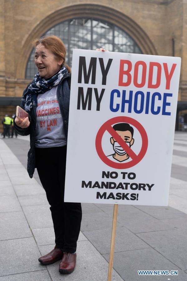 A protester holds a placard during an anti-lockdown protest in London, Britain, on Nov. 28, 2020. More than 60 people were arrested as anti-lockdown protesters clashed with police in central London on Saturday, local media reported. (Photo by Ray Tang/Xinhua)