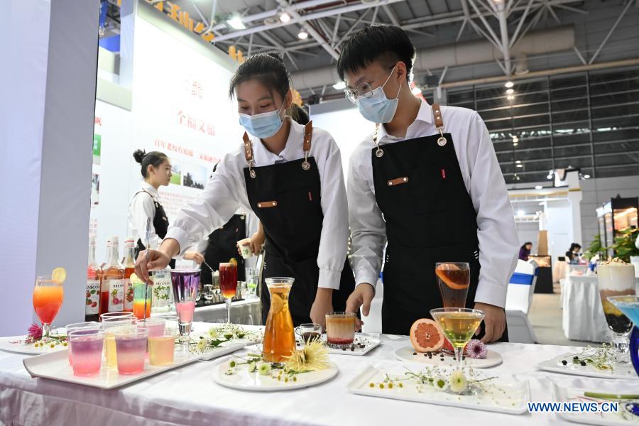 Students from a tourism secondary vocational school make drinks for visitors during the 6th Maritime Silk Road (Fuzhou) International Tourism Festival in Fuzhou, southeast China's Fujian Province, Nov. 27, 2020. The 6th Maritime Silk Road (Fuzhou) International Tourism Festival kicked off in Fuzhou on Friday. (Xinhua/Lin Shanchuan)