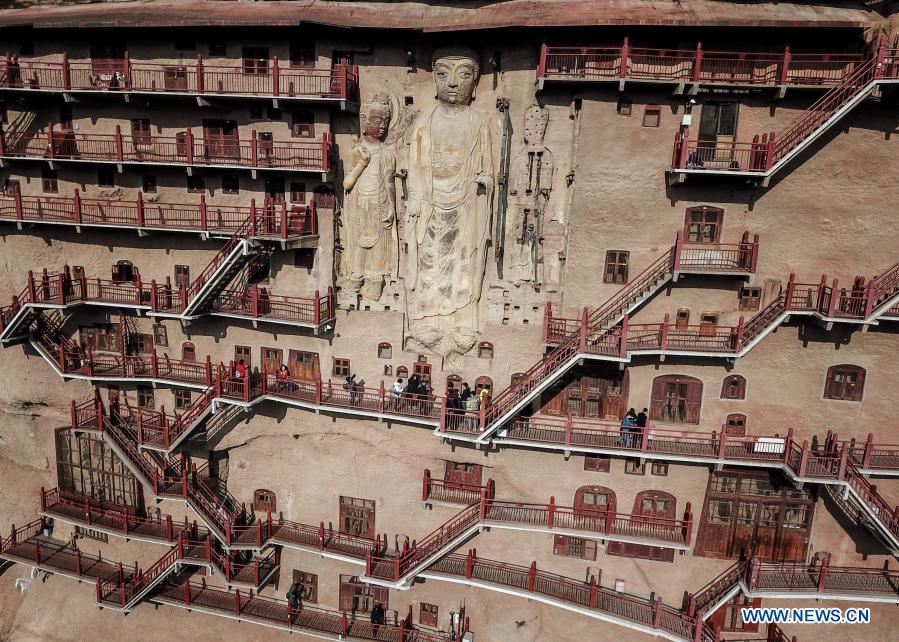 Aerial photo taken on Nov. 29, 2020 shows a view of the Maiji Mountain Grottoes in Tianshui, northwest China's Gansu Province. The Maiji Mountain Grottoes is one of the four most famous grottoes in China with 221 caves preserved at present. (Xinhua/Ma Xiping)