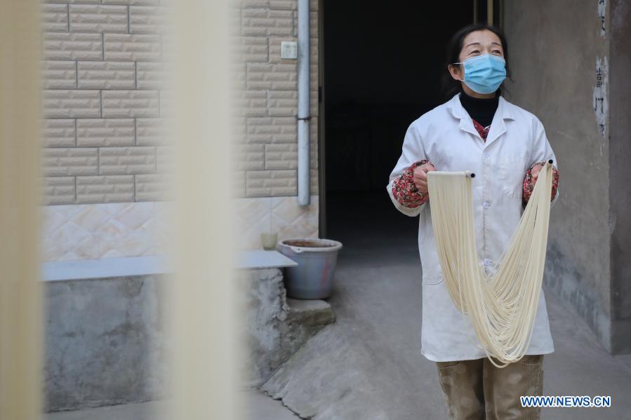 A villager prepares to air noodles at Huangjiazhuang Village in Maiji District of Tianshui City, northwest China's Gansu Province, Nov. 30, 2020. Noodle making in the village has a history of more than 200 years. The noodles are not only popular locally, but also sold across the country through e-commerce platform. (Xinhua/Ma Xiping)