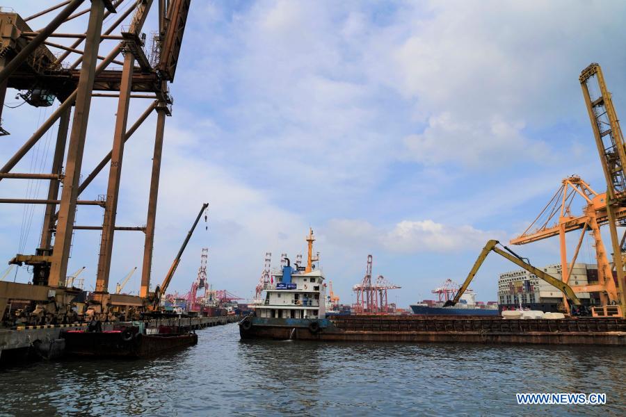 An engineering boat of the China Harbor Engineering Company (CHEC) stands by at the Jaya Container Terminal (JCT) at the Port of Colombo, Colombo, Sri Lanka, Dec. 1, 2020, getting ready for the JCT expansion project. CHEC has begun construction for the expansion of the Jaya Container Terminal (JCT) in the Port of Colombo in Sri Lanka. Expansion of the fifth phase of the JCT was initiated on Tuesday. (Xinhua/Tang Lu)