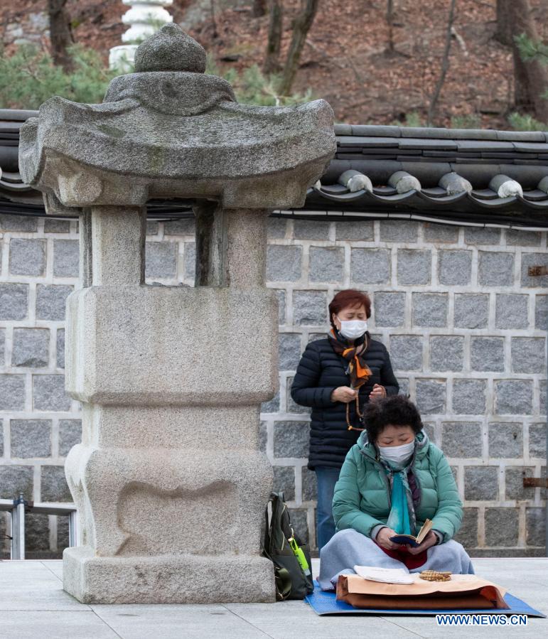 People pray at Doseonsa Temple for their family members who will take the College Scholastic Ability Test (CSAT) in Seoul, South Korea, Dec. 2, 2020. South Korean students will take the annual CSAT, which serves as the college entrance exam, on Thursday amid a sharp resurgence of coronavirus infections across the country. (Photo by Lee Sang-ho/Xinhua)