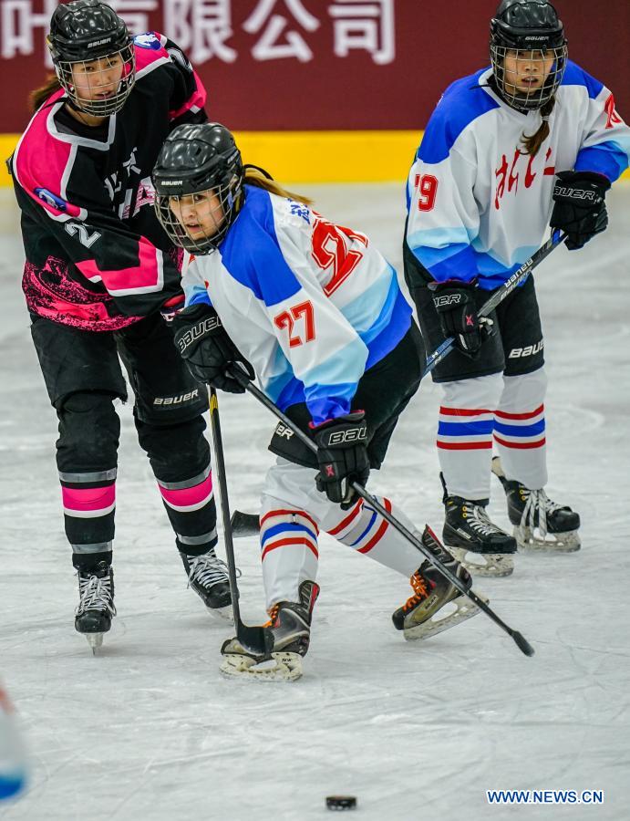 Zhao Yibo (C) of Zhejiang team competes during the women's ground B match between Beijing team and Zhejiang team at the National Ice Hockey Championships in Tengchong, southwest China's Yunnan Province, Dec. 2, 2020. Beijing team beat Zhejiang team 5-1. (Xinhua/Hu Chao)