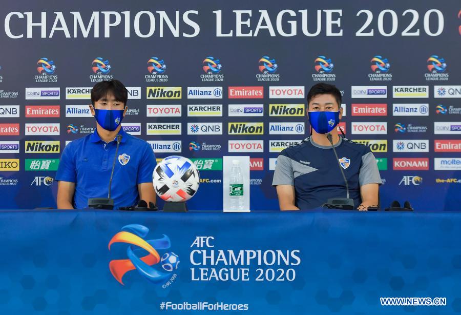 Kim Do-hoon (R), head coach of Ulsan Hyundai, and player Won Dujae attend the press conference ahead of the group F match between Shanghai Shenhua of China and Ulsan Hyundai FC of South Korea at the AFC Champions League 2020 in Doha, capital of Qatar, Dec. 2, 2020. (Photo by Nikku/Xinhua)