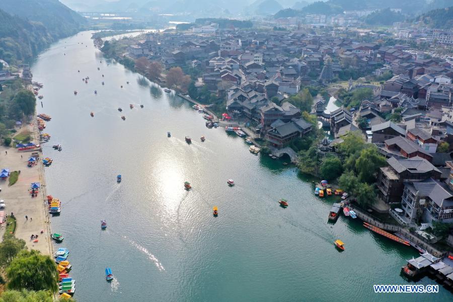 Aerial photo taken on Nov. 15, 2020 shows the view of Xiasi Ancient Town of Kaili in Qiandongnan Miao and Dong Autonomous Prefecture, southwest China's Guizhou Province. (Xinhua/Liu Xu)