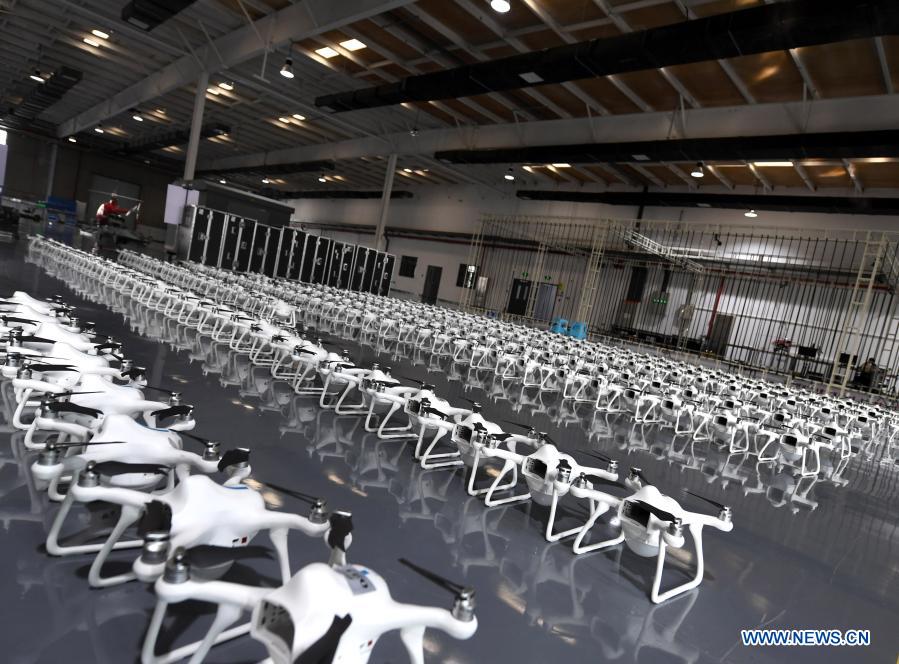 Photo taken on Dec. 1, 2020 shows a drone formation ready for testing at Tianjin EFY Technology Co., Ltd. in north China's Tianjin Municipality. The Binhai New Area in Tianjin has been actively boosting the development of drone industry in recent years by encouraging innovations among local companies. The district has built up a complete industrial chain of drone research, development, production and testing. (Xinhua/Zhao Zishuo)