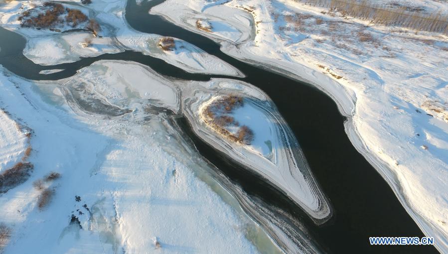 Aerial Photo taken on Dec. 3, 2020 shows scenery of Hailang River in Mudanjiang City, northeast China's Heilongjiang Province. (Photo by Zhang Chunxiang/Xinhua)