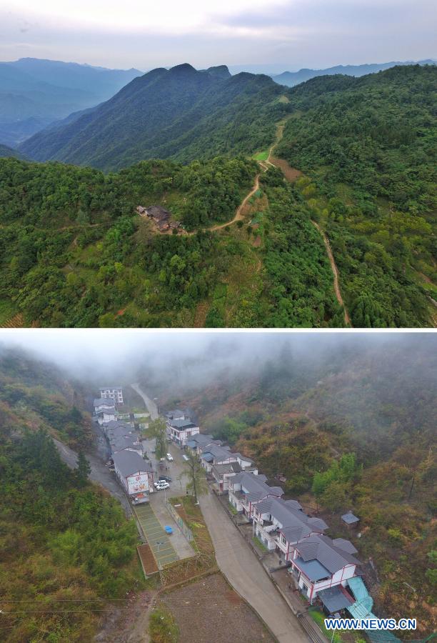 TOP: Aerial photo shows the old residence of Li Guozhi and a downhill path he made amid the Qinling-Daba mountains in Xiaoluoma Village, Nuoshuihe Township, Tongjiang County, southwest China's Sichuan Province, Sept. 22, 2016. BOTTOM: Aerial photo shows the relocation site where Li Guozhi lives in Xiaoluoma Village, Nuoshuihe Township, Tongjiang County, southwest China's Sichuan Province, April 2, 2020. Xiaoluoma is a village tucked away in the Qinling-Daba mountain areas of southwest China's Sichuan Province. For years, the villagers here had been living in poverty. In 2015, China's central government launched a "precision poverty relief" campaign which targeted such villages as Xiaoluoma. Since then a bunch of policies, including small loans, relocation and incentive programs began to benefit villages officially registered as "poor". Covered by the governmental campaign policy, poverty-stricken Xiaoluoma villagers saw a ray of hope. Li Guozhi was one of them. The beneficial terms he was offered had incentivized him to seriously think of shedding poverty. "Better strive than suffer," wrote Li on the mud wall of his dilapidated old house as self-encouragement, when the man waged his own anti-poverty war. To start with, Li launched an agricultural business that mixes animal husbandry and plant cultivation, on a 50,000-yuan (7,615-U.S. dollar) small loan. To transport his products, which range from cattle and sheep to corns and rattan pepper, Li purchased a motorized tricycle. He then flattened a mountaintop space and used it as a tricycle practice ground. After that, he also shoveled a path extending over one kilometer downhill. In just a few years, Li's business thrived. In 2019, his farm provided the family with an income exceeding 100,000 yuan (15,206 U.S. dollars). Over the past years, Li witnessed the life of his family getting better. In late 2016, Li's six-member family moved into a 150-square-meter two-storey house. Li paid 8,000 yuan (1,218 U.S. dollars) for the new residence while the remaining cost was subsidized by a poverty-relief relocation plan. (Xinhua/Liu Kun)