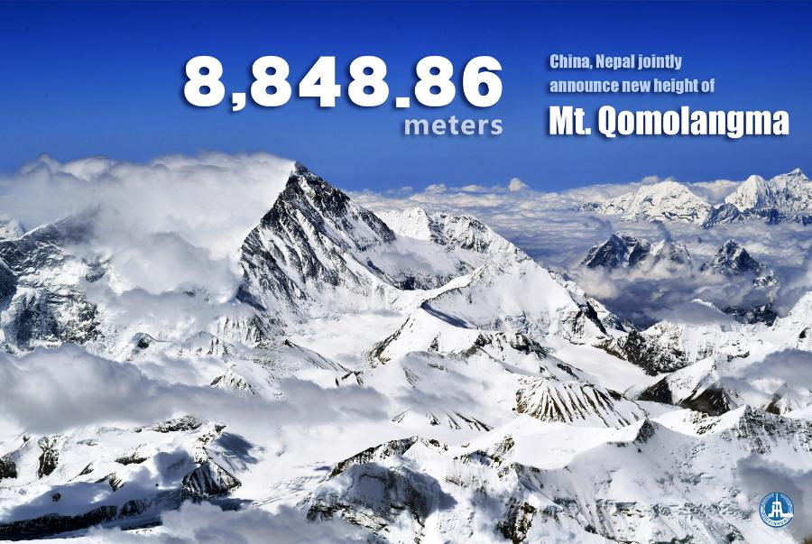 The new height of Mount Qomolangma, the world's highest peak, is 8,848.86 meters, China and Nepal jointly announced on Tuesday. (Xinhua/Liu Qian)