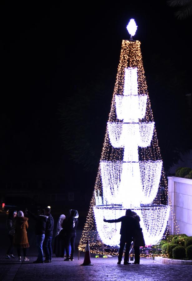 People visit a Christmas decoration in Damascus, Syria, on Dec. 9, 2020. (Photo by Ammar Safarjalani/Xinhua)