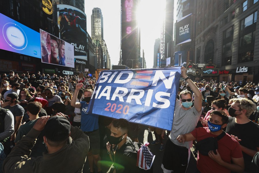 People gather at Times Square in New York, the United States, Nov. 7, 2020. (Xinhua/Wang Ying)