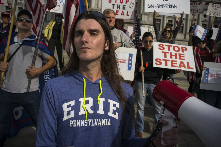 Supporters of U.S. President Donald Trump rally on the steps of Pennsylvania State Capitol building in Harrisburg, Pennsylvania, the United States, on Nov. 5, 2020. (Photo by Alan Chin/Xinhua)