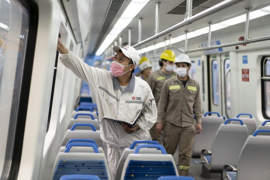 Chinese engineers and technicians with CRRC Qingdao Sifang Co., Ltd., together with their Argentine colleagues, inspect a train in Llavallol, some 33 km south of Buenos Aires, Argentina, Nov. 16, 2020. (Photo by Martin Zabala/Xinhua)