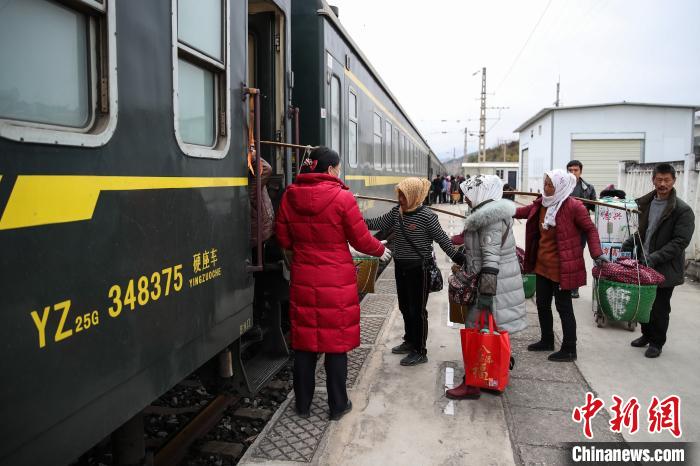 Farmers board train 5647 with their apples to be sold on the train at a railway station in Zhaotong, southwest China’s Yunnan province. (Photo/Chinanews.com)
