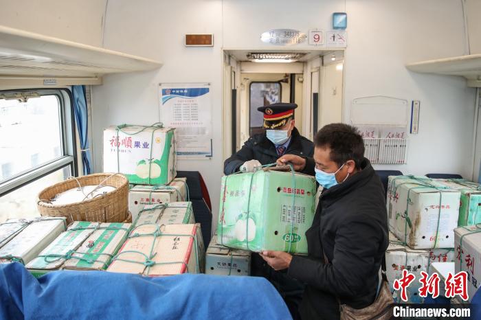 Zhuo Mingquan, chief conductor of the Guiyang section of train 5647, helps farmers place their apples on the train. (Photo/Chinanews.com)