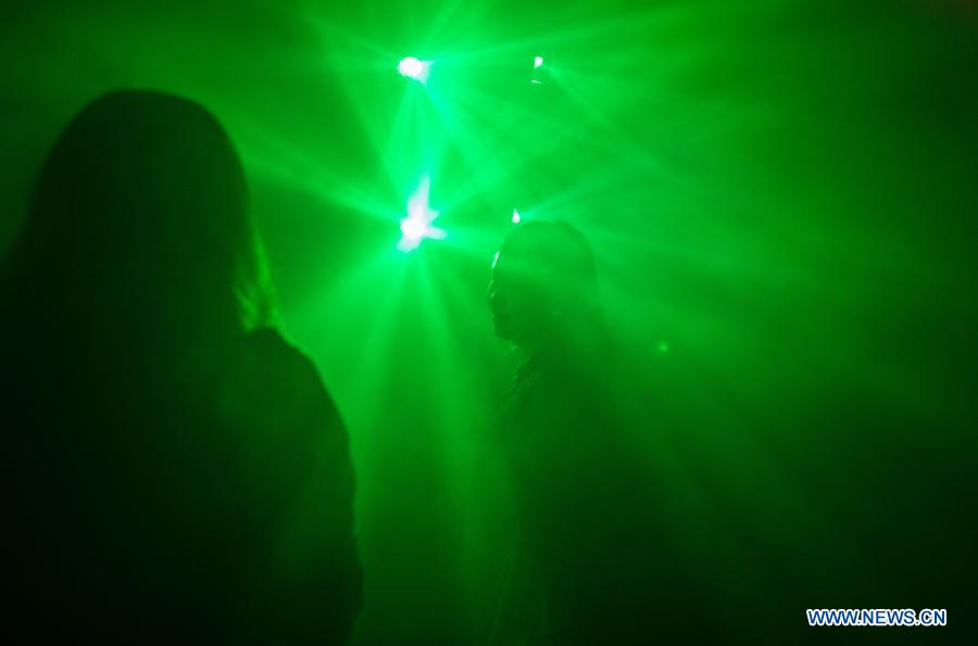 A woman poses for photos during the "Awakening Bangkok" lighting installation fest in Bangkok, Thailand, Dec. 15, 2020. (Xinhua/Zhang Keren)