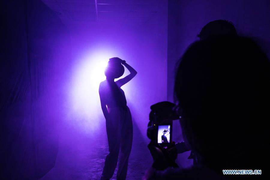 A tourist poses for photos during the "Awakening Bangkok" lighting installation fest in Bangkok, Thailand, Dec. 15, 2020. (Xinhua/Zhang Keren)