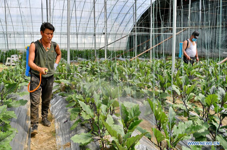 A farmer fertilizes eggplant seedlings in a green house in Nyingchi City, southwest China's Tibet Autonomous Region, March 22, 2020. Through the cultivation of modern agriculture, vegetables are no more rarities on the "roof of the world," making today's Tibetan tables more delicious, nutritious. (Xinhua/Zhang Rufeng)