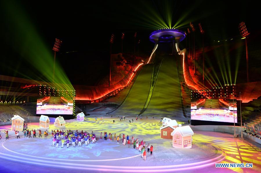 Photo taken on Dec. 21, 2020 shows performers participating in the opening ceremony of the second winter sports event of Hebei Province at the National Ski Jumping Center in Chongli District of Zhangjiakou City, north China's Hebei Province. (Xinhua/Jin Haoyuan)