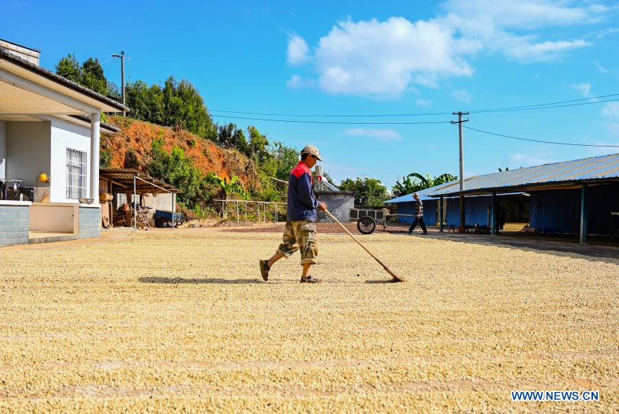 A villager dries coffee beans in Lisuo Village of Wa Autonomous County of Ximeng, southwest China's Yunnan Province, Dec. 21, 2020. (Xinhua/Wang Guansen)