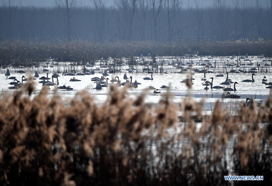 Swans are seen at a wetland park in Sanmenxia, central China's Henan Province, Dec. 21, 2020. A large number of migratory swans flied to the wetland from Siberia to spend winter. (Xinhua/Li Jianan)