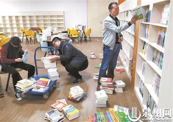 Yao Zhenlin (right) sort books with volunteers. (Photo/www.qzwb.com)