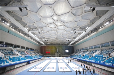 Photo shows the curling field with four standard tracks at the National Aquatics Center in Beijing. (Photo/Xinhua)