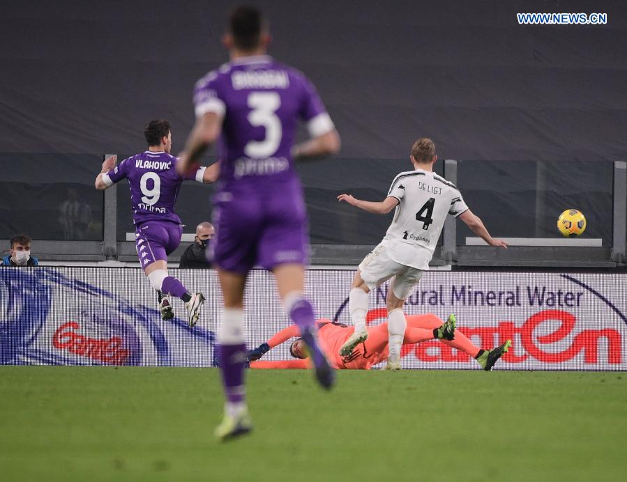 Fiorentina's Dusan Vlahovic (L) scores his goal during a Serie A soccer match between FC Juventus and Fiorentina in Turin, Italy, Dec. 22, 2020. (Photo by Alberto Lingria/Xinhua)