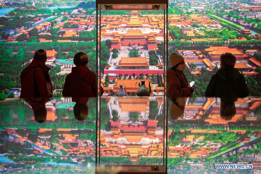 Visitors watch items on display at the "1420: Nanjing to Beijing" cultural relics exhibition marking the 600th anniversary of moving capital of the Ming Dynasty (1368-1644) in Nanjing, east China''s Jiangsu Province, Dec. 22, 2020. Orchestrated by the Nanjing Museum Administration, and featuring 340 pieces (sets) of selected cultural relics, the exhibition tells a story of how the Ming Dynasty moved its capital from Nanjing to Beijing exactly 600 years ago, and unveils the unique historical cultures in the two cities. (Photo by Su Yang/Xinhua)