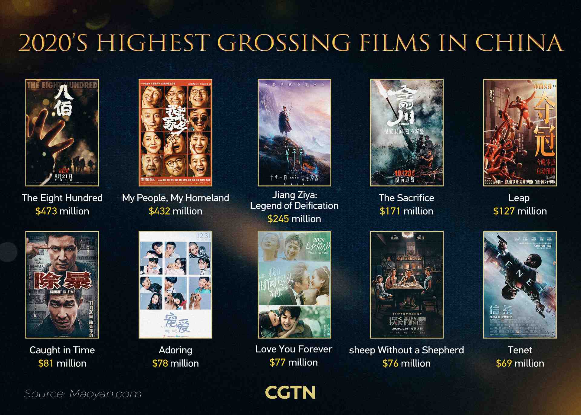 Eight out of the 10 biggest Chinese box office hits are domestic productions. The war epic "The Eight Hundred" tops the list, having pulled in over $473 million so far.