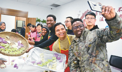 Foreign students of Jiangsu University of Science and Technology making dumplings with residents in Zhenjiang, east China’s Jiangsu province, to celebrate the Winter Solstice Festival, or Dongzhi on Dec. 21. (Photo/Shi Yucheng)