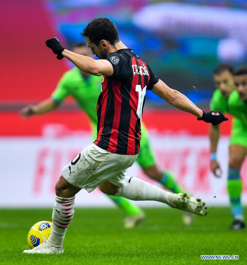 AC Milan's Hakan Calhanoglu scores his goal during a Serie A soccer match between AC Milan and Lazio in Milan , Italy, Dec. 23, 2020. (Xinhua)