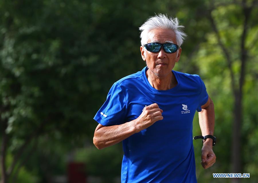Gu Dawo, an endurance sports enthusiast, runs in a forest park in Yinchuan, northwest China's Ningxia Hui Autonomous Region. (Xinhua/Jia Haocheng)