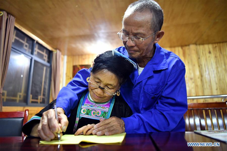 Villager Liang Anhe (R), 70, teaches his wife Liang Yingmi, 67, to write Chinese characters during a mandarin training program in Wuying Village. (Xinhua/Li Xin)