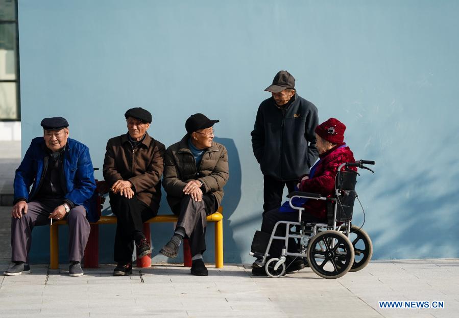 Seniors chat outside of a community elderly care center at the Suzhou Industrial Park in Suzhou, east China's Jiangsu Province. (Xinhua/Ji Chunpeng)