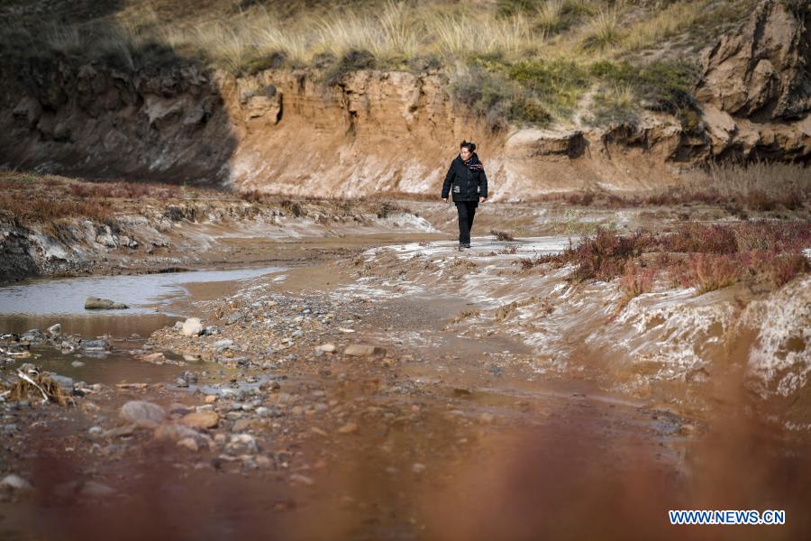 Ding Haiyan walks on the now obsolete trail leading to Hejiayuan Village of Xihaigu in northwest China''s Ningxia Hui Autonomous Region, Oct. 28, 2020. Xihaigu, a largely mountainous region in northwest Ningxia, was once inflicted by deep poverty and labeled the "most unfit place for human settlement" by the United Nations in the 1970s due to land reclamation, drought, and a fragile ecological environment. On Nov. 16, 2020, Xihaigu historically bid farewell to absolute poverty, during which "she power" played an indispensable role. Ding Haiyan, 55, is chairwoman of the trade union of water supplies bureau of Wuzhong City in Ningxia. She transferred to Hejiayuan Village in Yuwang Township of draught-haunted county of Tongxin in central Ningxia in 2015 starting her new career as a poverty alleviation cadre. To Ding''s great disappointment, most villagers there were seniors or the disabled who had no access to paved roads and electric power for industrial purposes, and little confidence in her will and power. Despite these, Ding insisted on making door-to-door visits to get her head around the basic situation there. She came up with a two-pillar strategy to simultaneously improve villagers'' income and infrastructure in the village. She also tailored individual poverty-alleviation plans for each household in the village. Started with livestock breeding, villagers had more and more confidence in Ding as they saw steadily increasing income. Ding also managed to multiply the villagers'' sources of income by encouraging production of specialty grains like millet and buckwheat. Thanks to her efforts, a paved road was also accomplished to bring output of the village to wider markets. Looking at an almost ready canteen for senior citizens, the last one of her promises to the villagers in Hejiayuan, Ding admitted that she occasionally shed tears due to the difficulties she had to confront, but she would never forget the villagers'' eyes with expectation and her responsibility for them. (Xinhua/Feng Kaihua)
