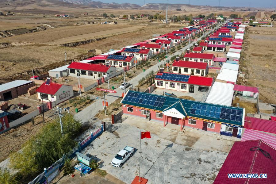 Aerial photo taken on Oct. 28, 2020 shows the new buildings at Hejiayuan Village of Xihaigu in northwest China''s Ningxia Hui Autonomous Region. Xihaigu, a largely mountainous region in northwest Ningxia, was once inflicted by deep poverty and labeled the "most unfit place for human settlement" by the United Nations in the 1970s due to land reclamation, drought, and a fragile ecological environment. On Nov. 16, 2020, Xihaigu historically bid farewell to absolute poverty, during which "she power" played an indispensable role. Ding Haiyan, 55, is chairwoman of the trade union of water supplies bureau of Wuzhong City in Ningxia. She transferred to Hejiayuan Village in Yuwang Township of draught-haunted county of Tongxin in central Ningxia in 2015 starting her new career as a poverty alleviation cadre. To Ding''s great disappointment, most villagers there were seniors or the disabled who had no access to paved roads and electric power for industrial purposes, and little confidence in her will and power. Despite these, Ding insisted on making door-to-door visits to get her head around the basic situation there. She came up with a two-pillar strategy to simultaneously improve villagers'' income and infrastructure in the village. She also tailored individual poverty-alleviation plans for each household in the village. Started with livestock breeding, villagers had more and more confidence in Ding as they saw steadily increasing income. Ding also managed to multiply the villagers'' sources of income by encouraging production of specialty grains like millet and buckwheat. Thanks to her efforts, a paved road was also accomplished to bring output of the village to wider markets. Looking at an almost ready canteen for senior citizens, the last one of her promises to the villagers in Hejiayuan, Ding admitted that she occasionally shed tears due to the difficulties she had to confront, but she would never forget the villagers'' eyes with expectation and her responsibility for them. (Xinhua/Feng Kaihua)