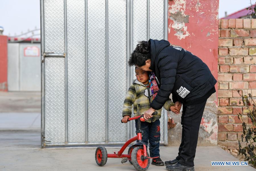 Ding Haiyan greets a child in Hejiayuan Village of Xihaigu in northwest China''s Ningxia Hui Autonomous Region, Oct. 28, 2020. Xihaigu, a largely mountainous region in northwest Ningxia, was once inflicted by deep poverty and labeled the "most unfit place for human settlement" by the United Nations in the 1970s due to land reclamation, drought, and a fragile ecological environment. On Nov. 16, 2020, Xihaigu historically bid farewell to absolute poverty, during which "she power" played an indispensable role. Ding Haiyan, 55, is chairwoman of the trade union of water supplies bureau of Wuzhong City in Ningxia. She transferred to Hejiayuan Village in Yuwang Township of draught-haunted county of Tongxin in central Ningxia in 2015 starting her new career as a poverty alleviation cadre. To Ding''s great disappointment, most villagers there were seniors or the disabled who had no access to paved roads and electric power for industrial purposes, and little confidence in her will and power. Despite these, Ding insisted on making door-to-door visits to get her head around the basic situation there. She came up with a two-pillar strategy to simultaneously improve villagers'' income and infrastructure in the village. She also tailored individual poverty-alleviation plans for each household in the village. Started with livestock breeding, villagers had more and more confidence in Ding as they saw steadily increasing income. Ding also managed to multiply the villagers'' sources of income by encouraging production of specialty grains like millet and buckwheat. Thanks to her efforts, a paved road was also accomplished to bring output of the village to wider markets. Looking at an almost ready canteen for senior citizens, the last one of her promises to the villagers in Hejiayuan, Ding admitted that she occasionally shed tears due to the difficulties she had to confront, but she would never forget the villagers'' eyes with expectation and her responsibility for them. (Xinhua/Yang Zhisen)