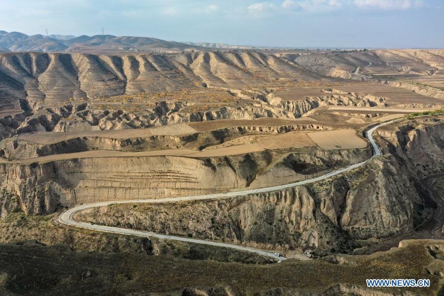 Aerial photo taken on Oct. 28, 2020 shows a paved road leading to Hejiayuan Village of Xihaigu in northwest China''s Ningxia Hui Autonomous Region. Xihaigu, a largely mountainous region in northwest Ningxia, was once inflicted by deep poverty and labeled the "most unfit place for human settlement" by the United Nations in the 1970s due to land reclamation, drought, and a fragile ecological environment. On Nov. 16, 2020, Xihaigu historically bid farewell to absolute poverty, during which "she power" played an indispensable role. Ding Haiyan, 55, is chairwoman of the trade union of water supplies bureau of Wuzhong City in Ningxia. She transferred to Hejiayuan Village in Yuwang Township of draught-haunted county of Tongxin in central Ningxia in 2015 starting her new career as a poverty alleviation cadre. To Ding''s great disappointment, most villagers there were seniors or the disabled who had no access to paved roads and electric power for industrial purposes, and little confidence in her will and power. Despite these, Ding insisted on making door-to-door visits to get her head around the basic situation there. She came up with a two-pillar strategy to simultaneously improve villagers'' income and infrastructure in the village. She also tailored individual poverty-alleviation plans for each household in the village. Started with livestock breeding, villagers had more and more confidence in Ding as they saw steadily increasing income. Ding also managed to multiply the villagers'' sources of income by encouraging production of specialty grains like millet and buckwheat. Thanks to her efforts, a paved road was also accomplished to bring output of the village to wider markets. Looking at an almost ready canteen for senior citizens, the last one of her promises to the villagers in Hejiayuan, Ding admitted that she occasionally shed tears due to the difficulties she had to confront, but she would never forget the villagers'' eyes with expectation and her responsibility for them. (Xinhua/Wang Peng)
