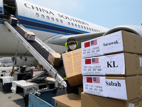 A worker unloads medical supplies brought by a medical team from China to Malaysia at Kuala Lumpur International Airport, Malaysia, April 18, 2020. (Chinese Embassy in Malaysia/Handout via Xinhua)