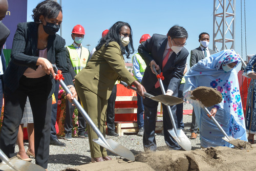 Ethiopian Health Minister Lia Tadesse (1st L, front), Liu Yuxi (3rd L, front), head of the Chinese Mission to the African Union and other guests attend the groundbreaking ceremony for the China-aided Africa Centers for Disease Control and Prevention (Africa CDC) headquarters in Addis Ababa, Ethiopia, Dec. 14, 2020. (Xinhua/Michael Tewelde)