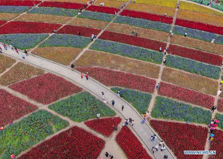 Aerial photo taken on Dec. 26, 2020 shows tourists enjoying flowers at the Shimen National Forest Park in Guangzhou, south China's Guangdong Province. (Xinhua/Deng Hua)