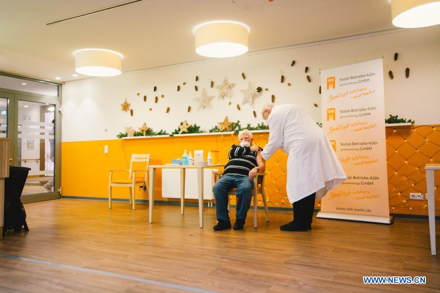 A resident of the Senior Centre Riehl receives an injection with a dose of COVID-19 vaccine at the Senior Centre Riehl in Cologne, Germany, Dec. 27, 2020. (Photo by Tang Ying/Xinhua)