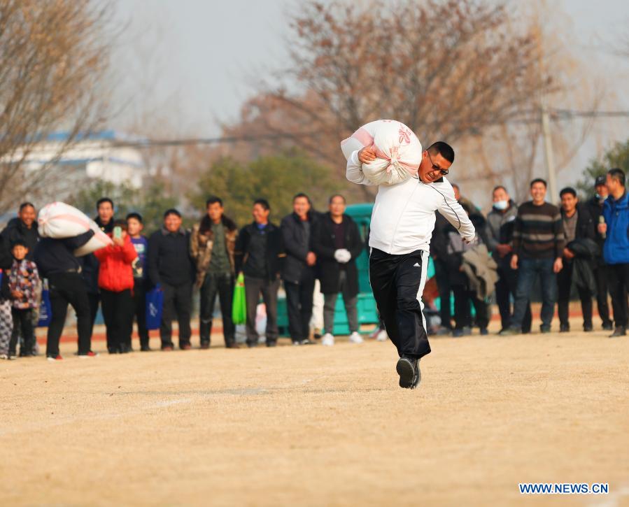 A farmer runs with a sack of grain on the shoulder during a game in Yaogou Township of Sihong County in Suqian, east China's Jiangsu Province, Dec. 27, 2020. The fun games, held annually in Yaogou Township before the New Year's Day since 2018, consist of eight interesting competitions which are close to farmers' life this year. (Photo by Xu Changliang/Xinhua)