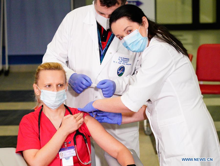 Doctor Agnieszka Szarowska receives coronavirus vaccination in Warsaw, Poland on Dec. 27, 2020. (Photo by Jaap Arriens/Xinhua)