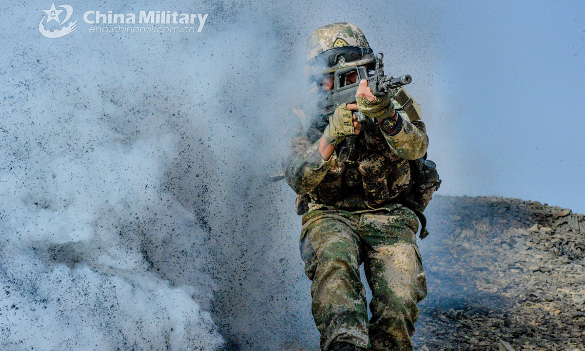 A soldier assigned to a combined arms brigade under the PLA 76th Group Army uses smoke bombs to create a smokescreen for concealment as he engages mock enemy with his rifle during a real-combat drill on September 26, 2020, which aims to beef up soldiers' courage and uprightness in battlefield. Photo: China Military