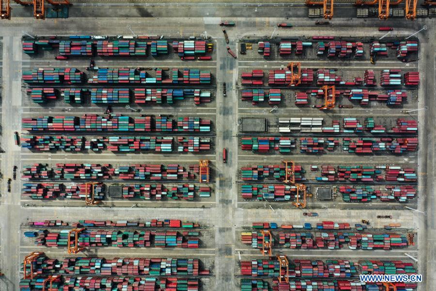 Aerial photo taken on Nov. 19, 2020 shows containers piled at the Qinzhou Port in south China's Guangxi Zhuang Autonomous Region. The five millionth twenty-foot equivalent unit (TEU) containers in 2020 was handled at the Qinzhou Port area of the Beibu Gulf Port on Monday, marking the Beibu Gulf Port's container throughput reaching 5 million TEUs this year. The Beibu Gulf Port currently has 268 berths for commercial vessels. A total of 52 shipping routes link the gulf with many ports both at home and abroad, including major ASEAN ports, according to the Beibu Gulf Port Group. (Xinhua/Zhang Ailin)